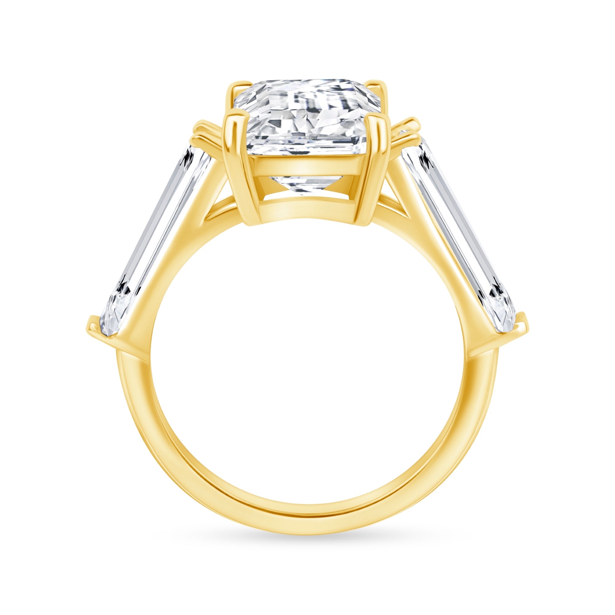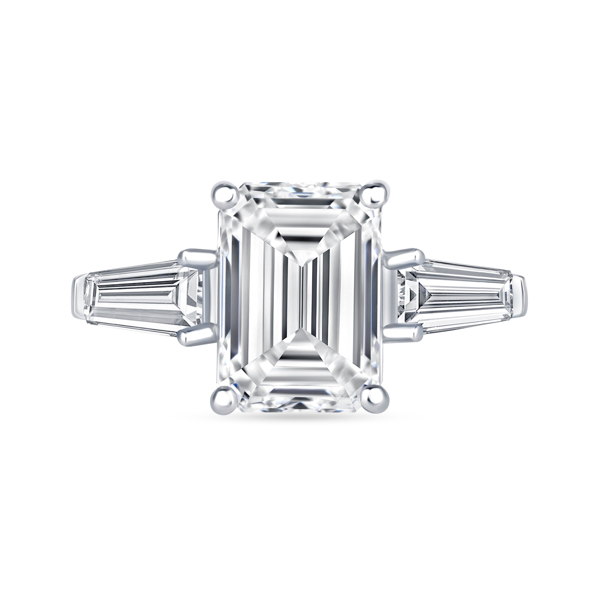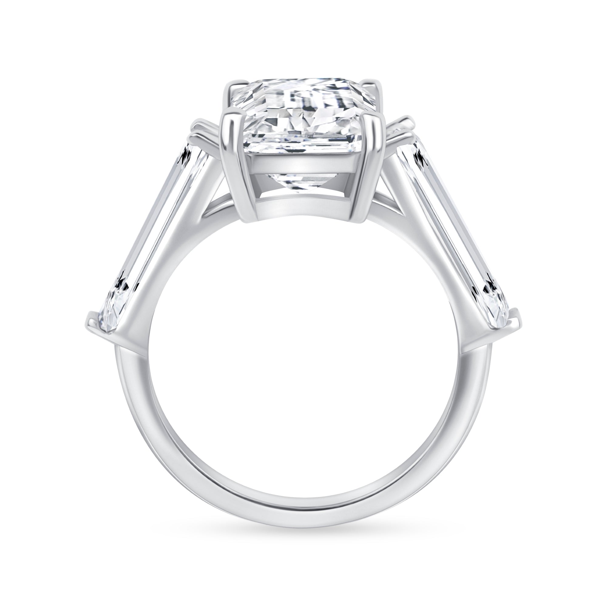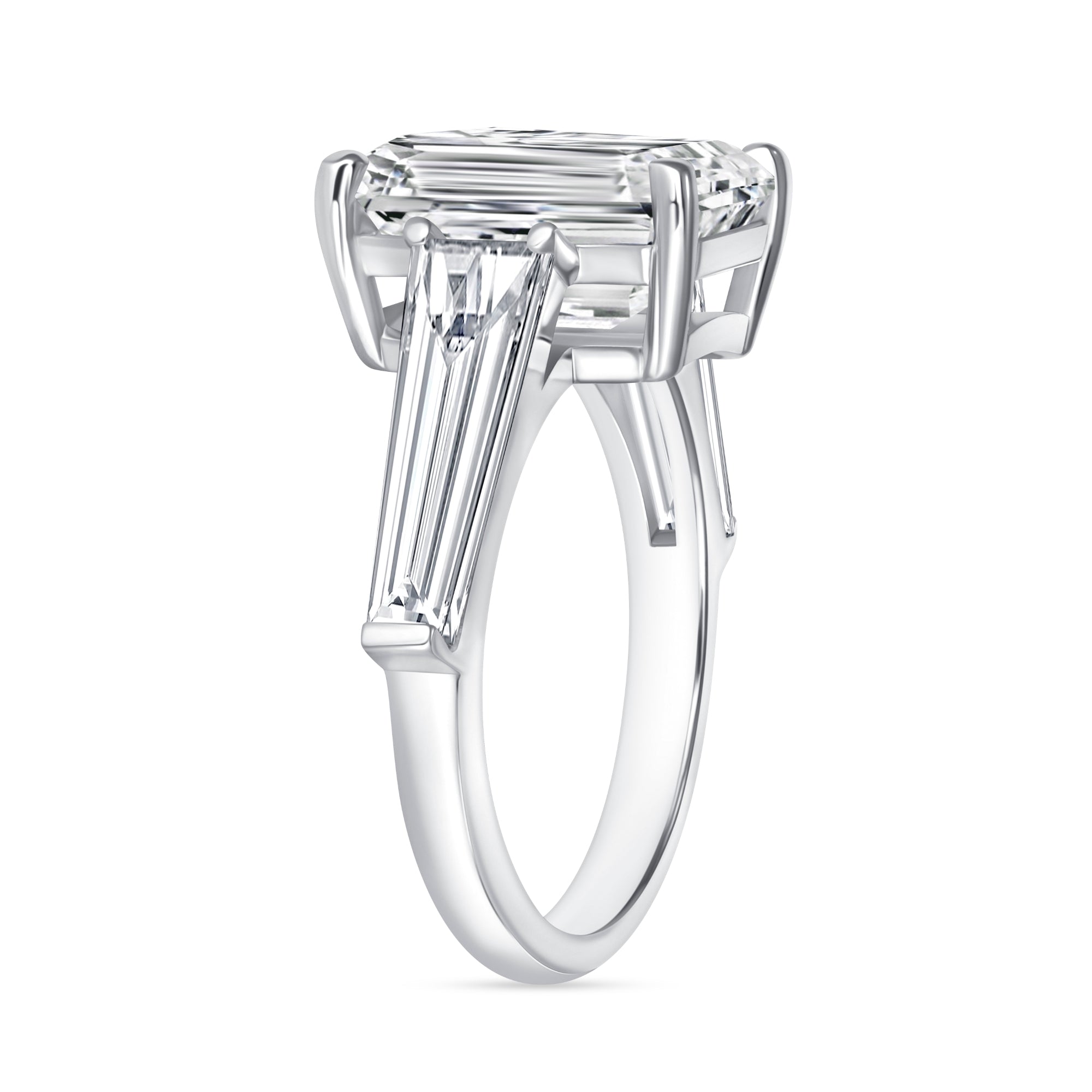 A lasting symbol of love, this three-stone engagement ring features two tapered baguette lab grown diamonds that elegantly frame the brilliant 5ct emerald cutcenter stone, offering a harmonious blend of symmetry and timeless style.