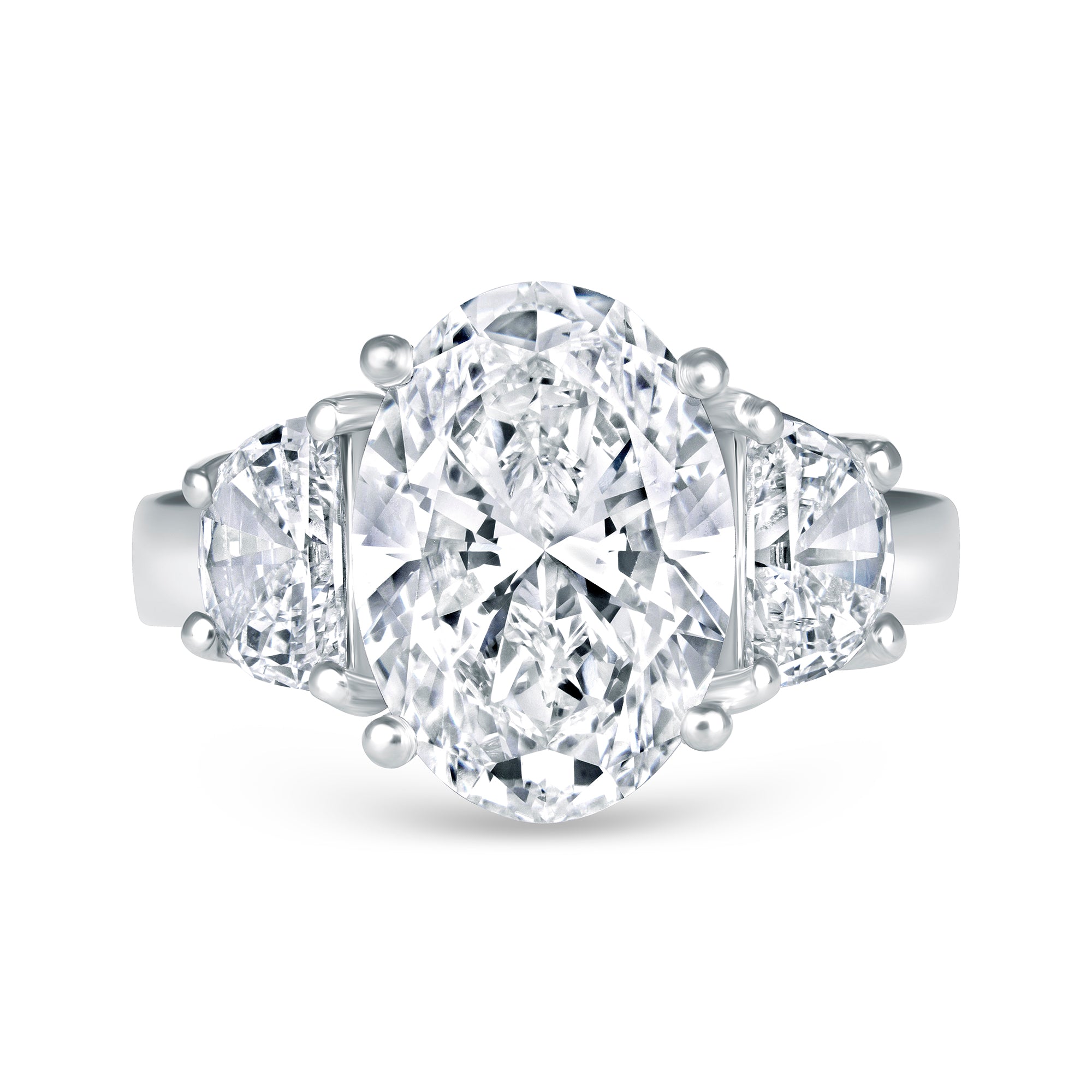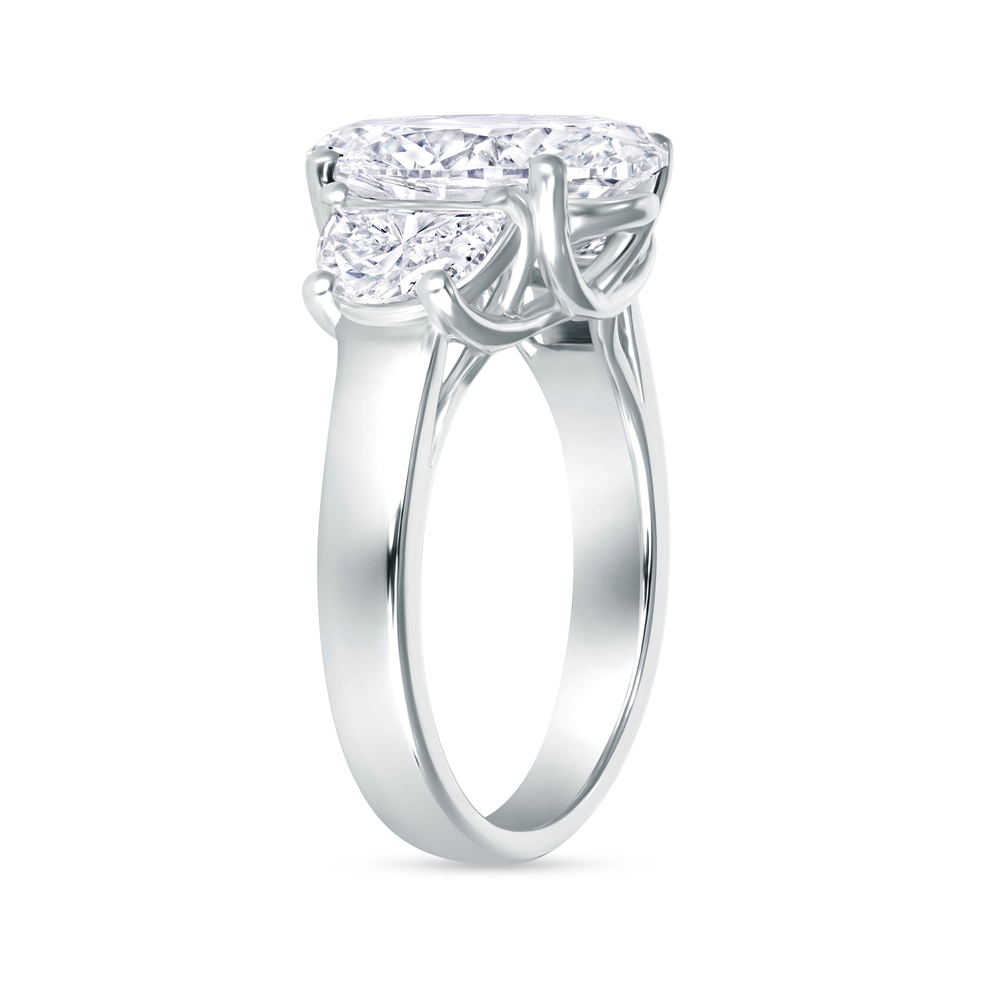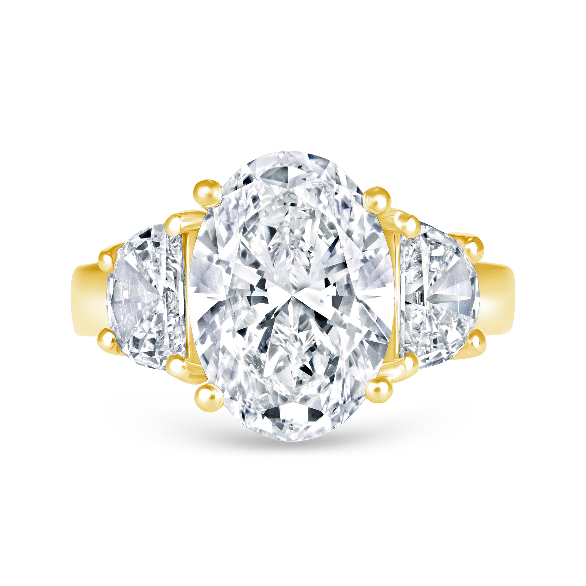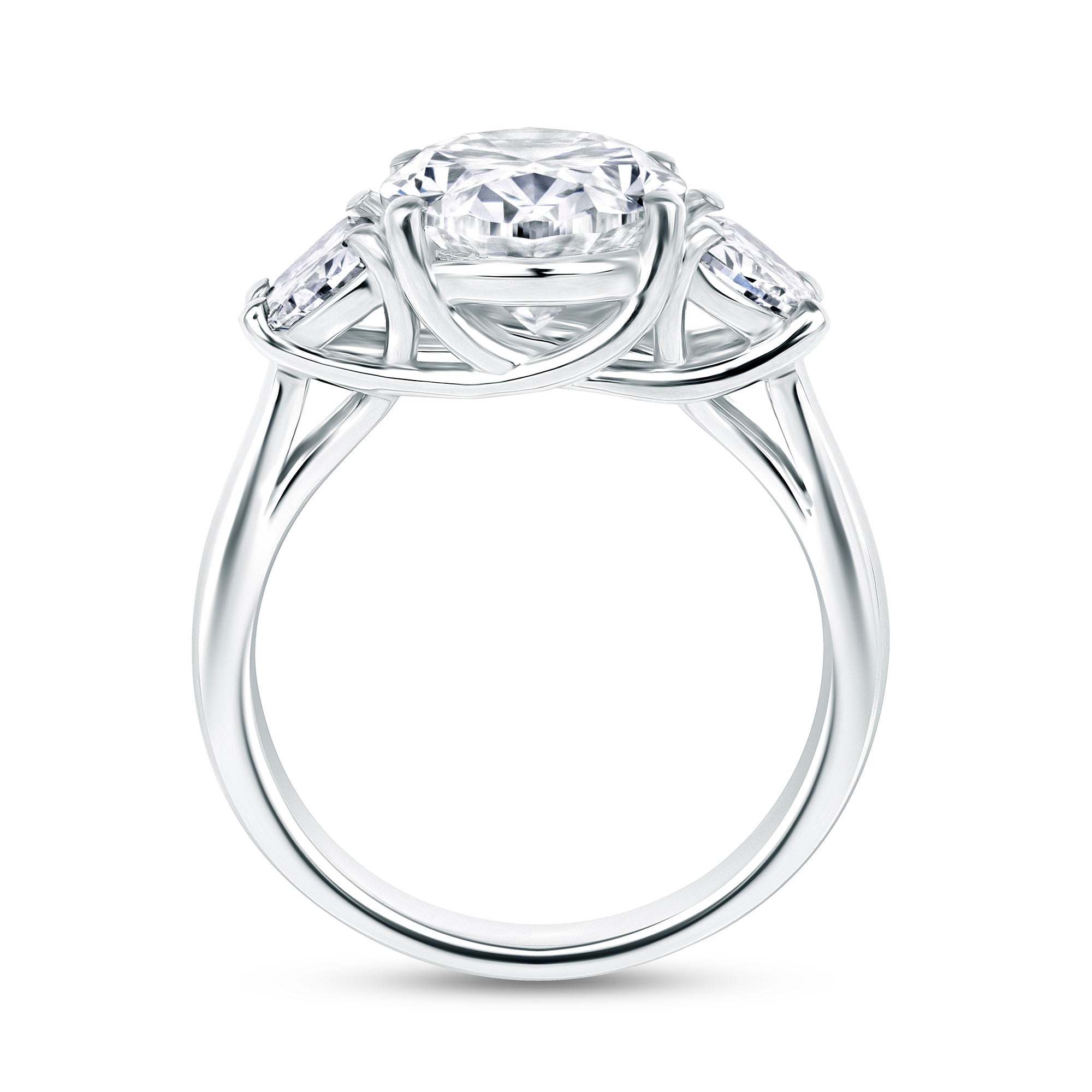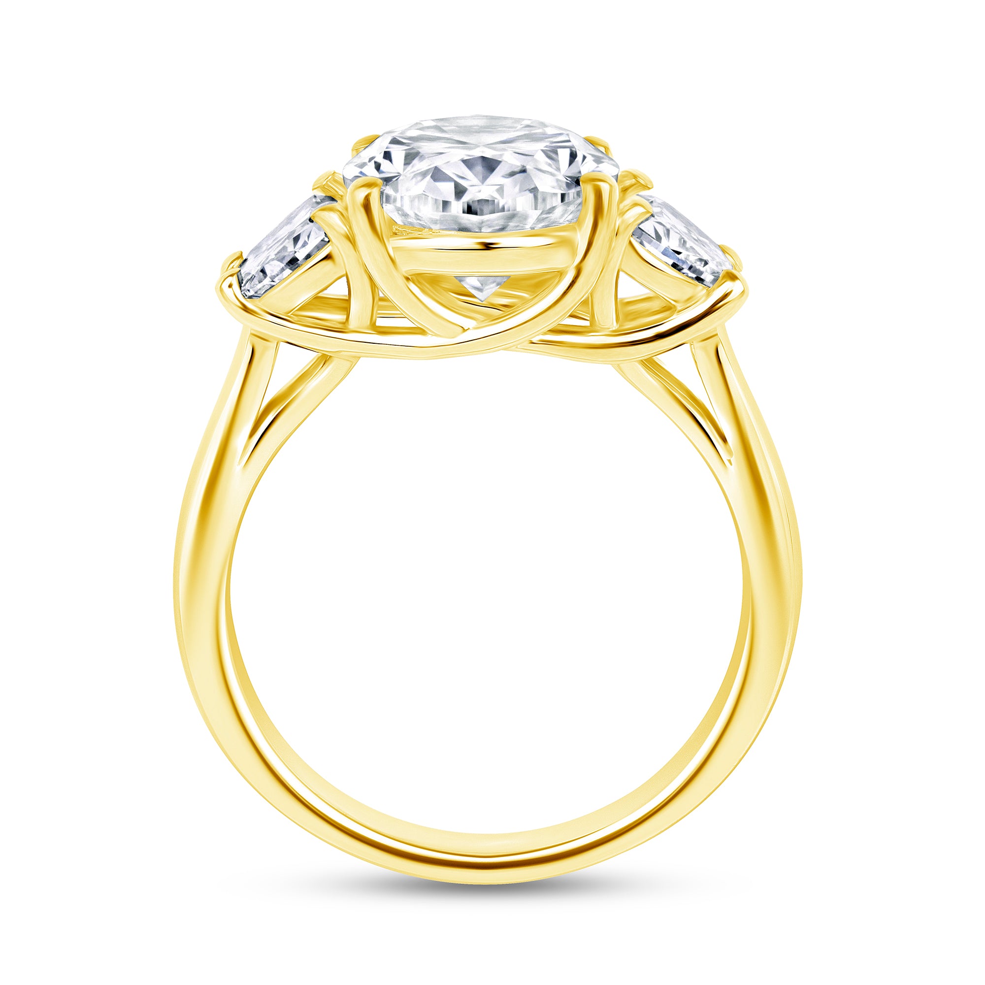 This three-stone engagement ring features a brilliant oval cut lab diamond at its center, flanked by crescent moon–shaped side lab diamonds for a celestial touch. The design blends timeless romance with a modern, whimsical twist, symbolizing love that shines in every phase.