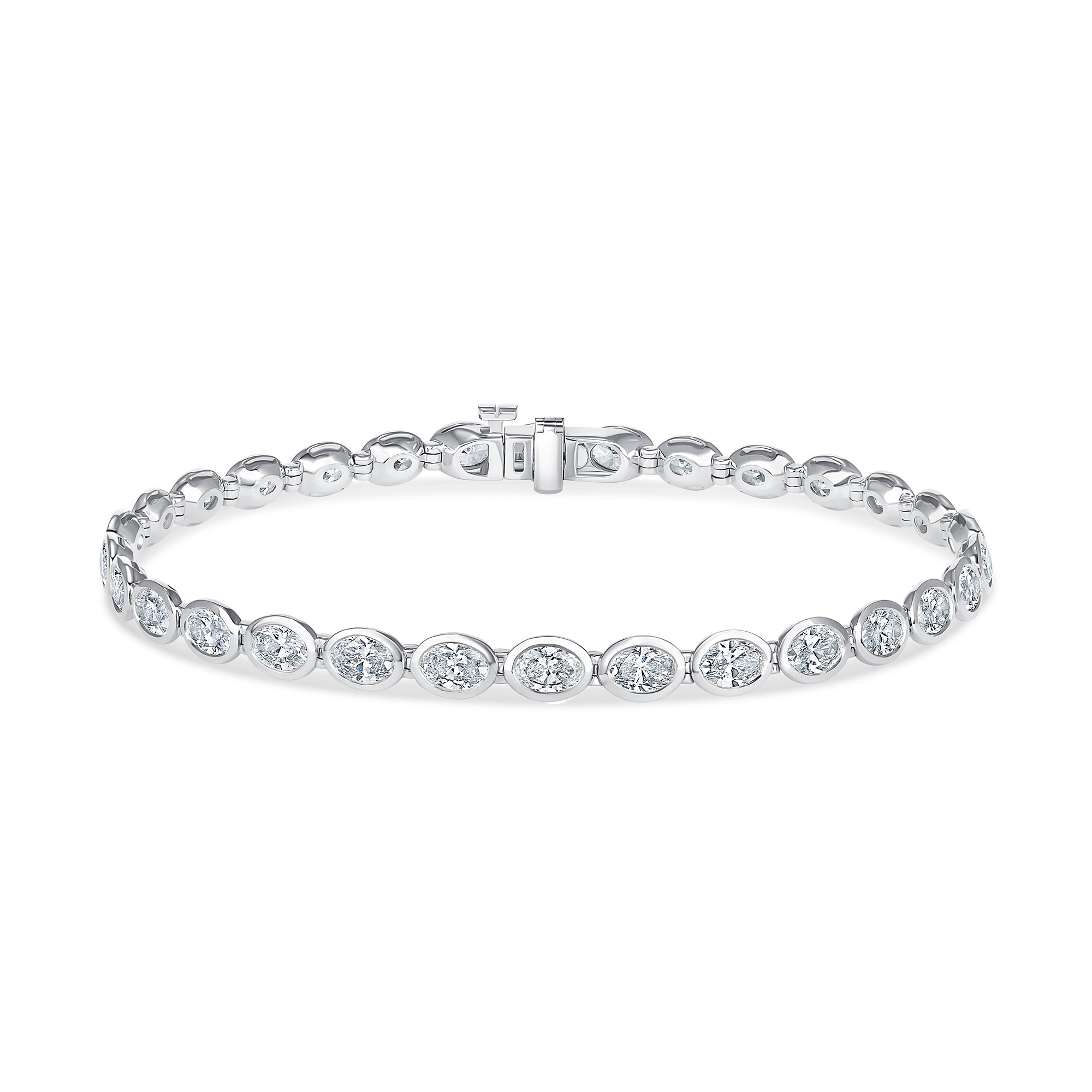Sophisticated yet distinctive, this tennis bracelet features oval-shaped diamonds set east-west in sleek bezel settings. Each lab-grown diamond shines brilliantly within its frame, creating a luminous display that dances effortlessly with the light.