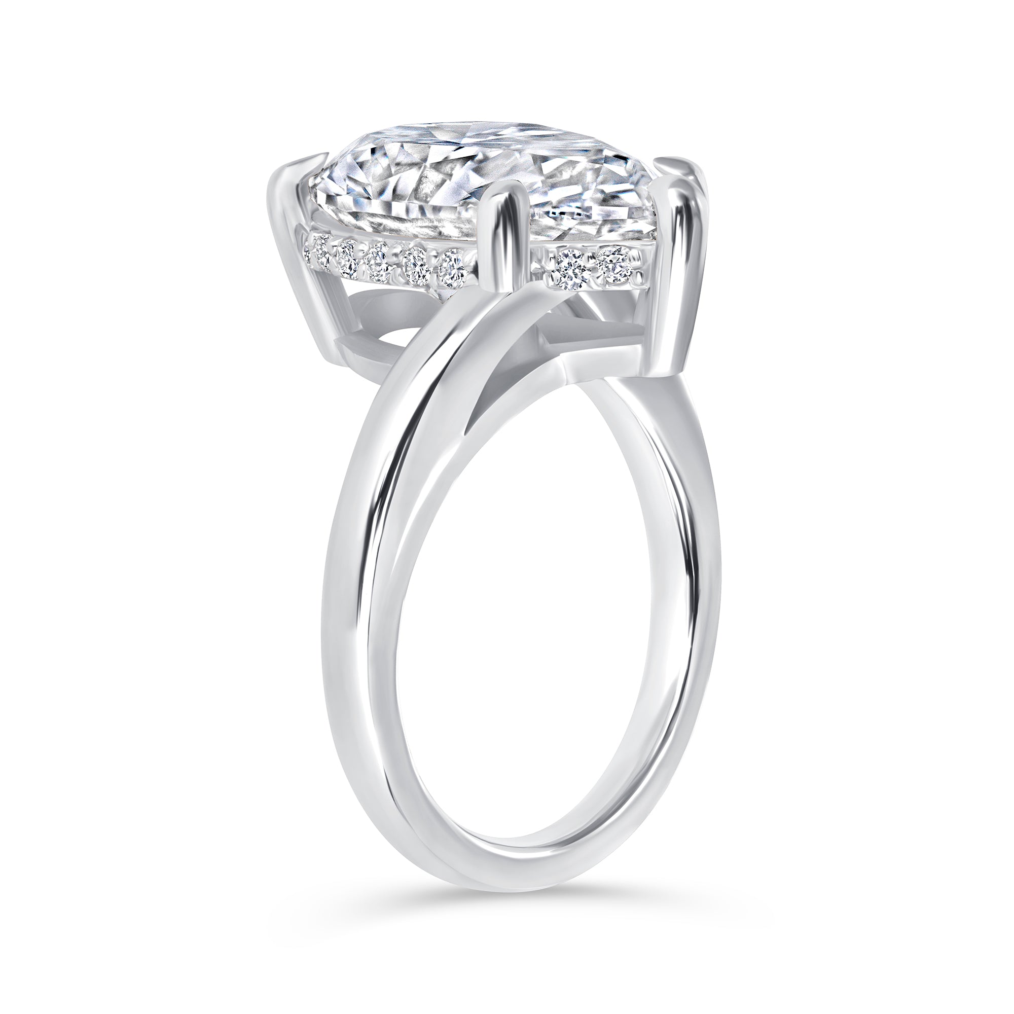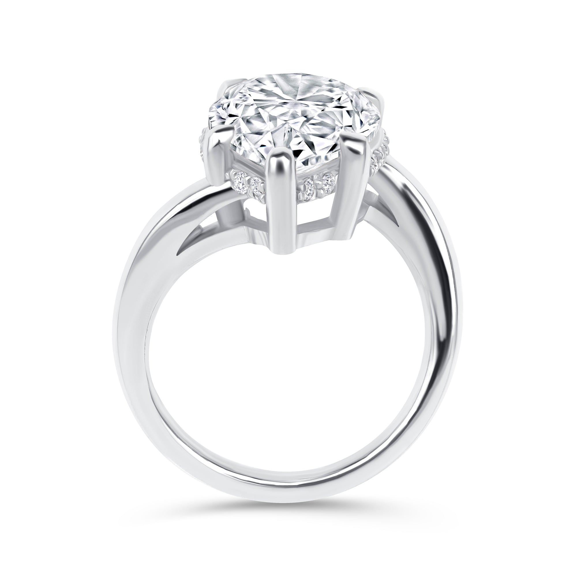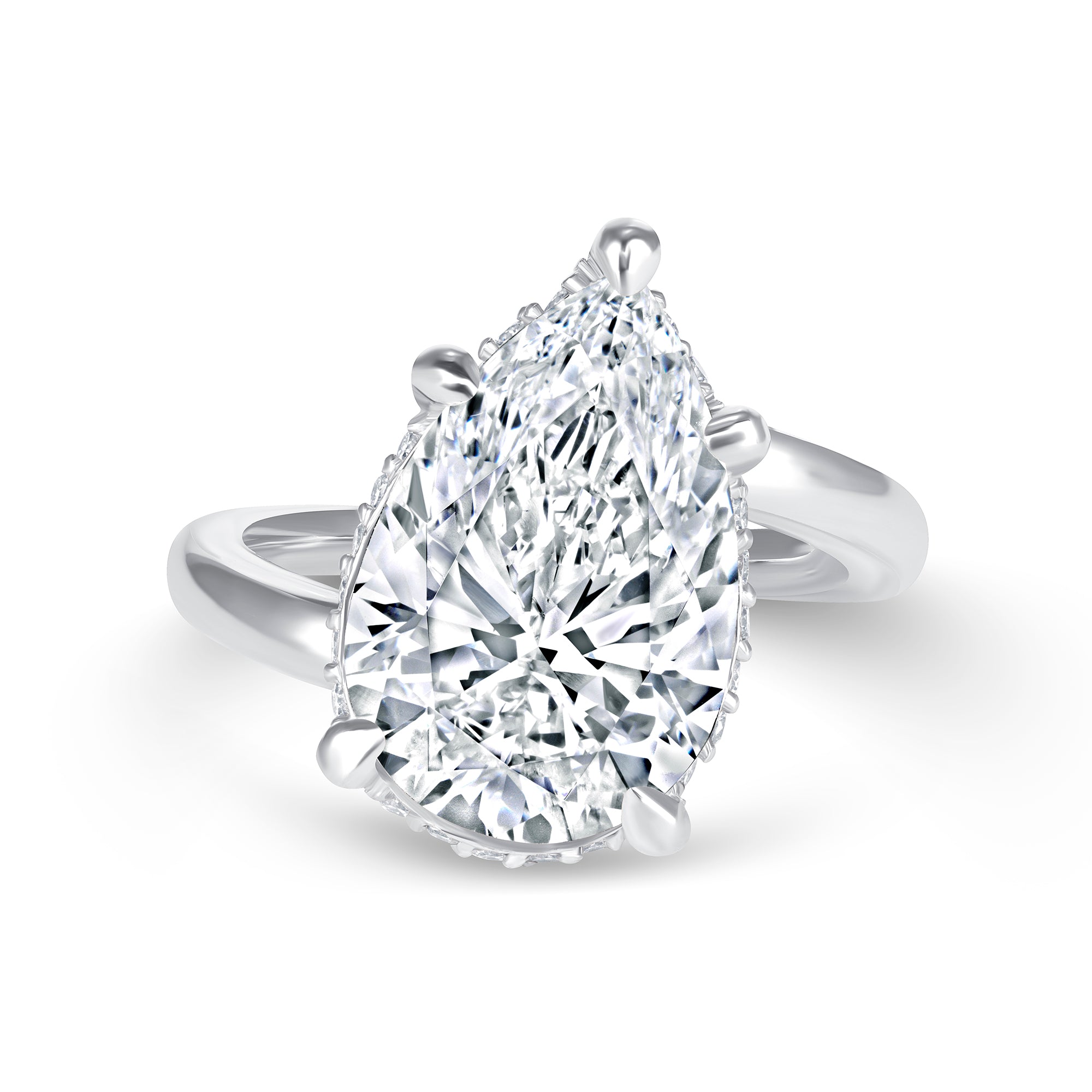 This prong-set pear cut design offers the perfect silhouette to highlight a striking solitaire, secured on a delicate, minimal band. The airy setting creates the illusion of the diamond floating on the hand, while open prongs invite light from every angle—shown here with 5 prongs, tilted 20° to the right.