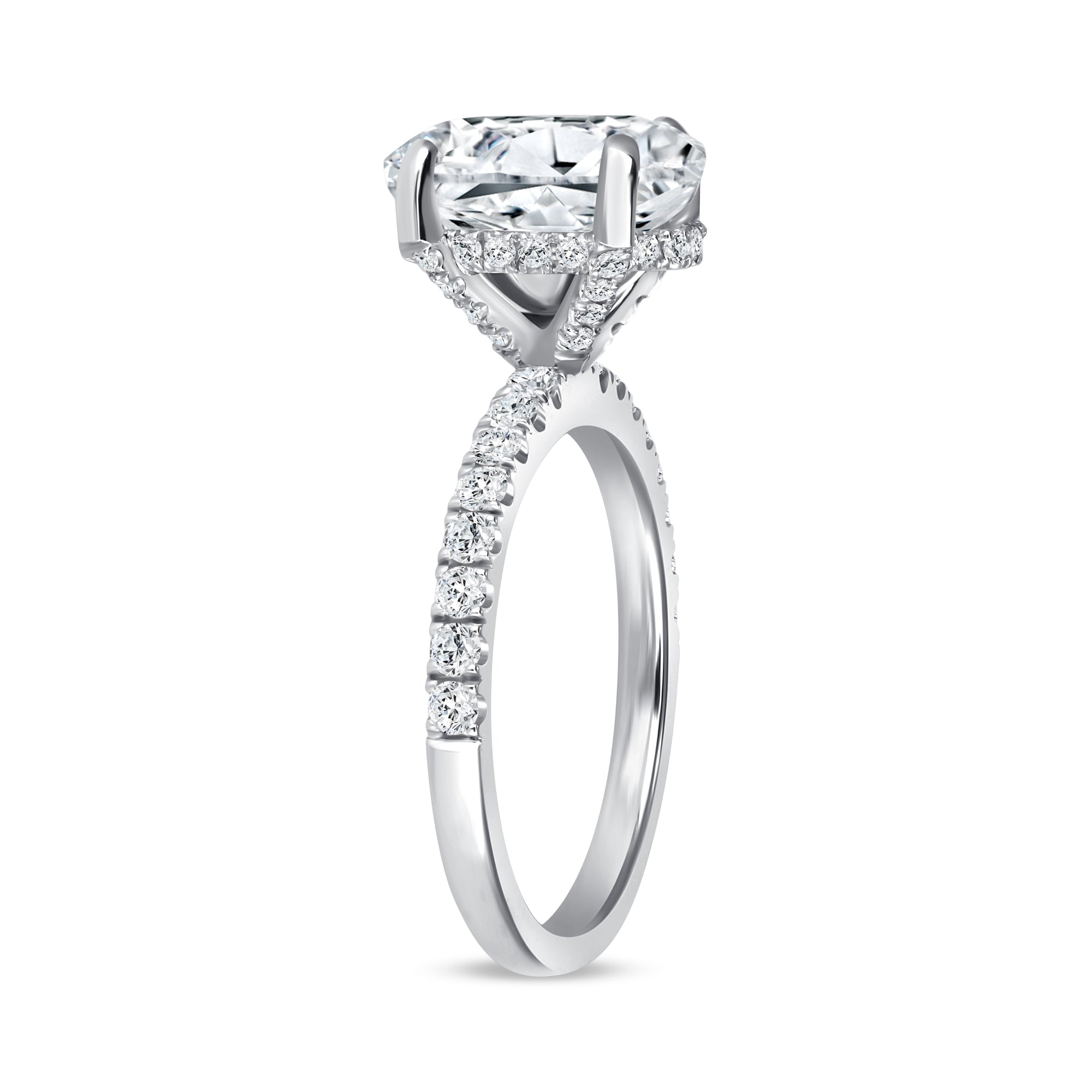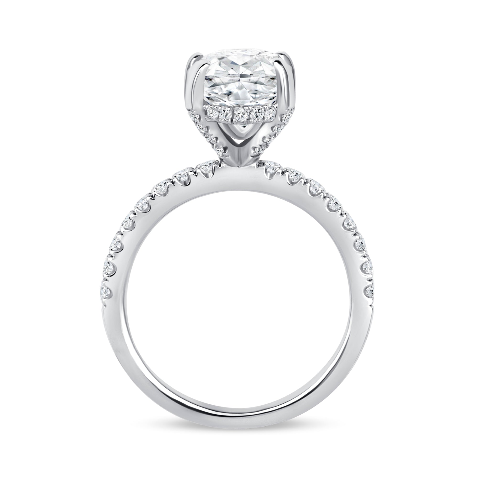 Celebrate your love with this breathtaking Diamond Pavé Hidden Halo Engagement Ring, featuring a gorgeous lab-grown 3ct oval cut diamond. This IGI-certified diamond offers timeless beauty with a commitment to ethical sourcing — the perfect symbol for your forever promise. It shines brightly due to the pavé band and hidden halo diamonds that sit beneath the center stone and on the prongs.