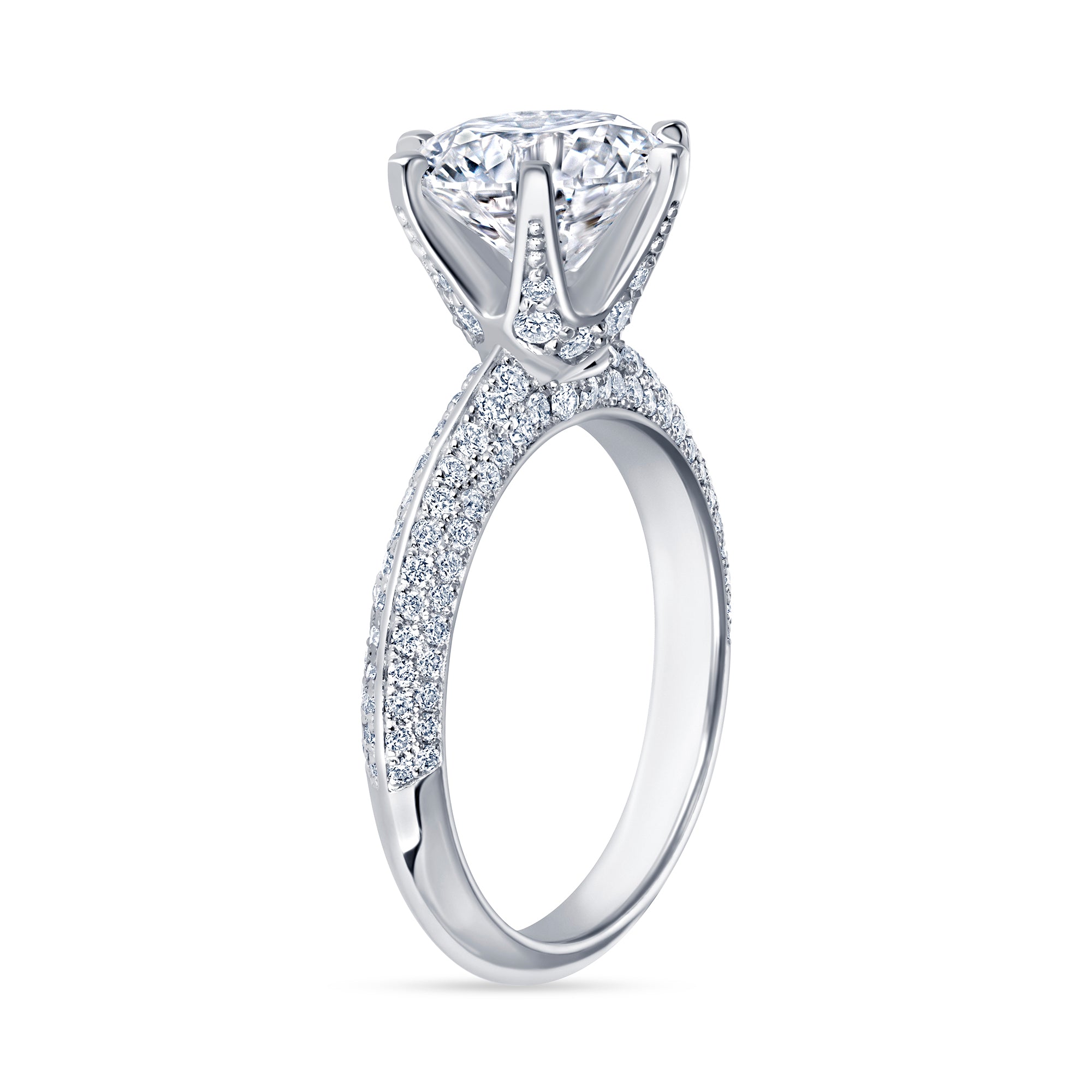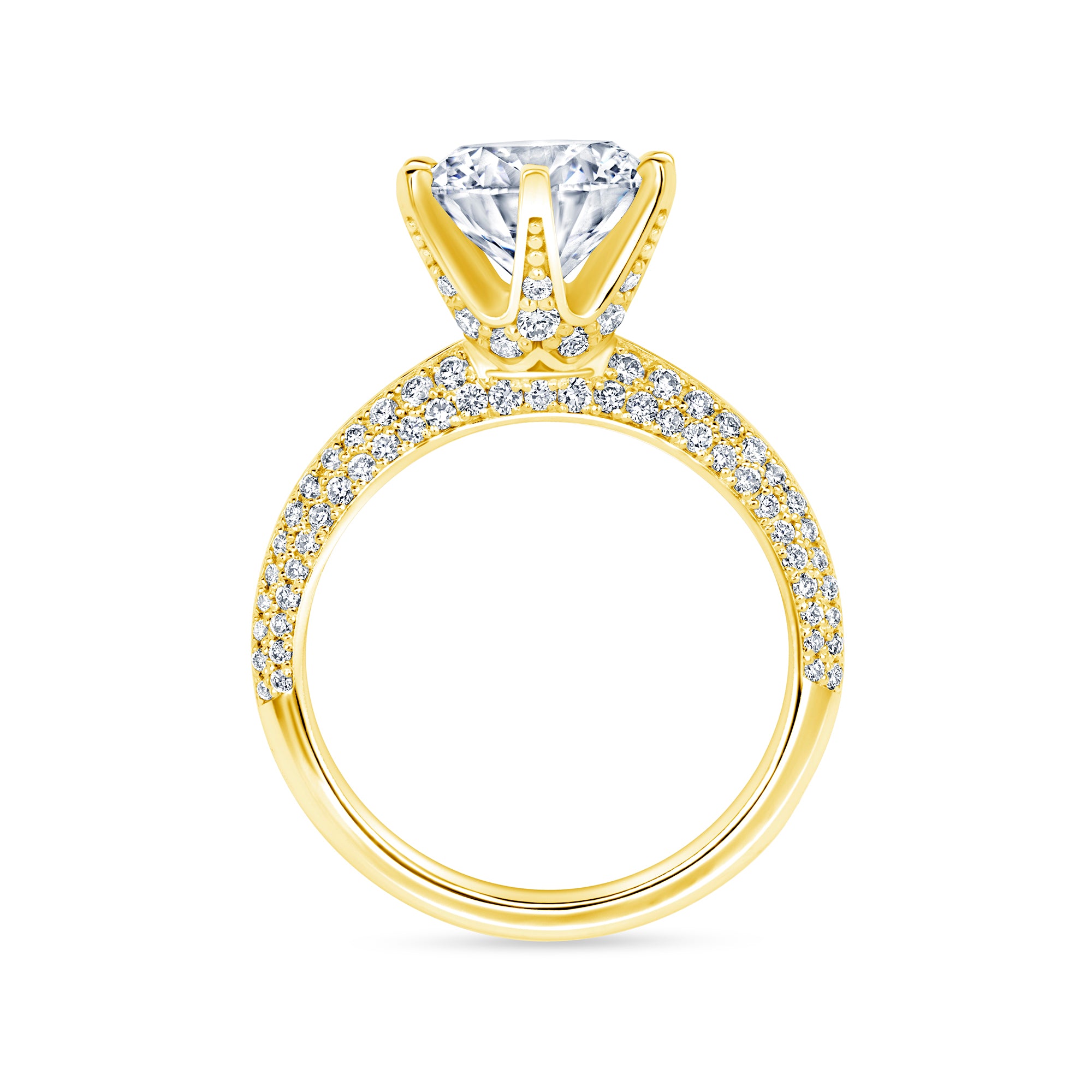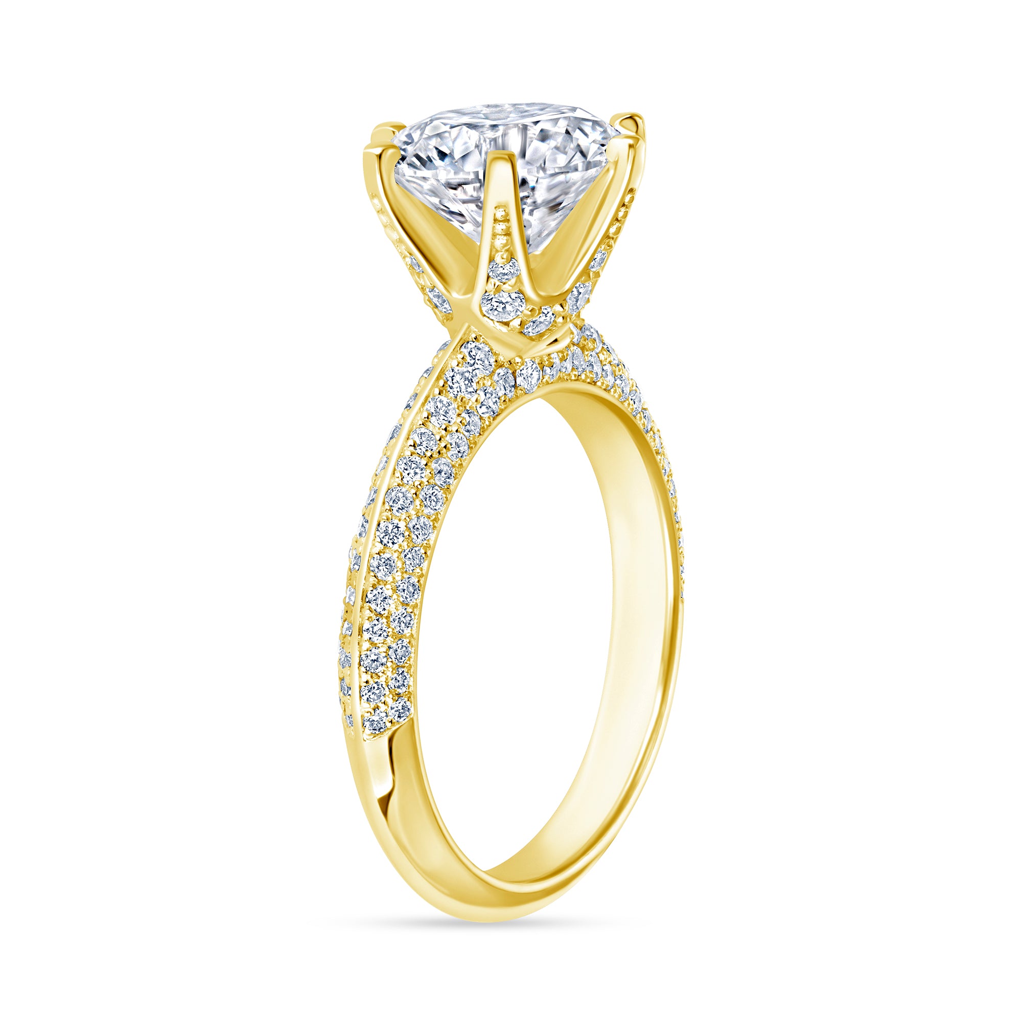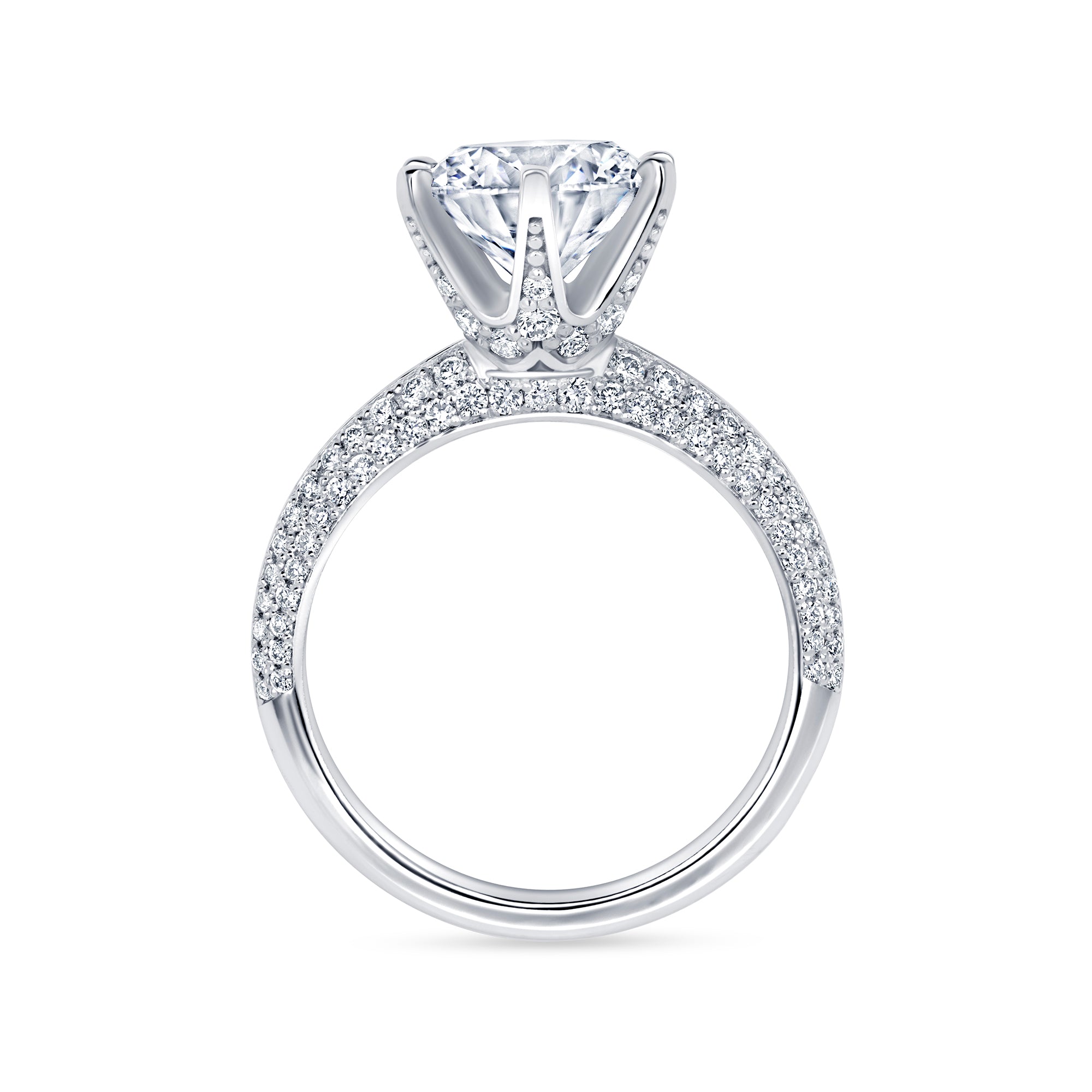 This round cut diamond engagement ring sparkles at every glance, featuring a brilliant center stone enhanced by pavé diamonds cascading down both angles of the band. The design delivers maximum radiance and timeless elegance, making it a classic yet captivating choice.