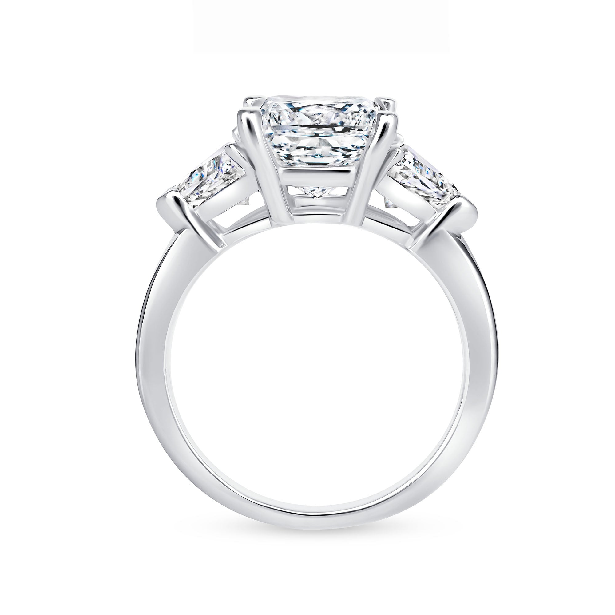 Symbolizing your unwavering love and passion, this Three Stone Diamond Engagement Ring is as unique as your bond. Featuring two bold trillion-cut side diamonds, this modern three-stone setting beautifully frames the 3ct princess cut diamond — symbolizing the past, present, and future.