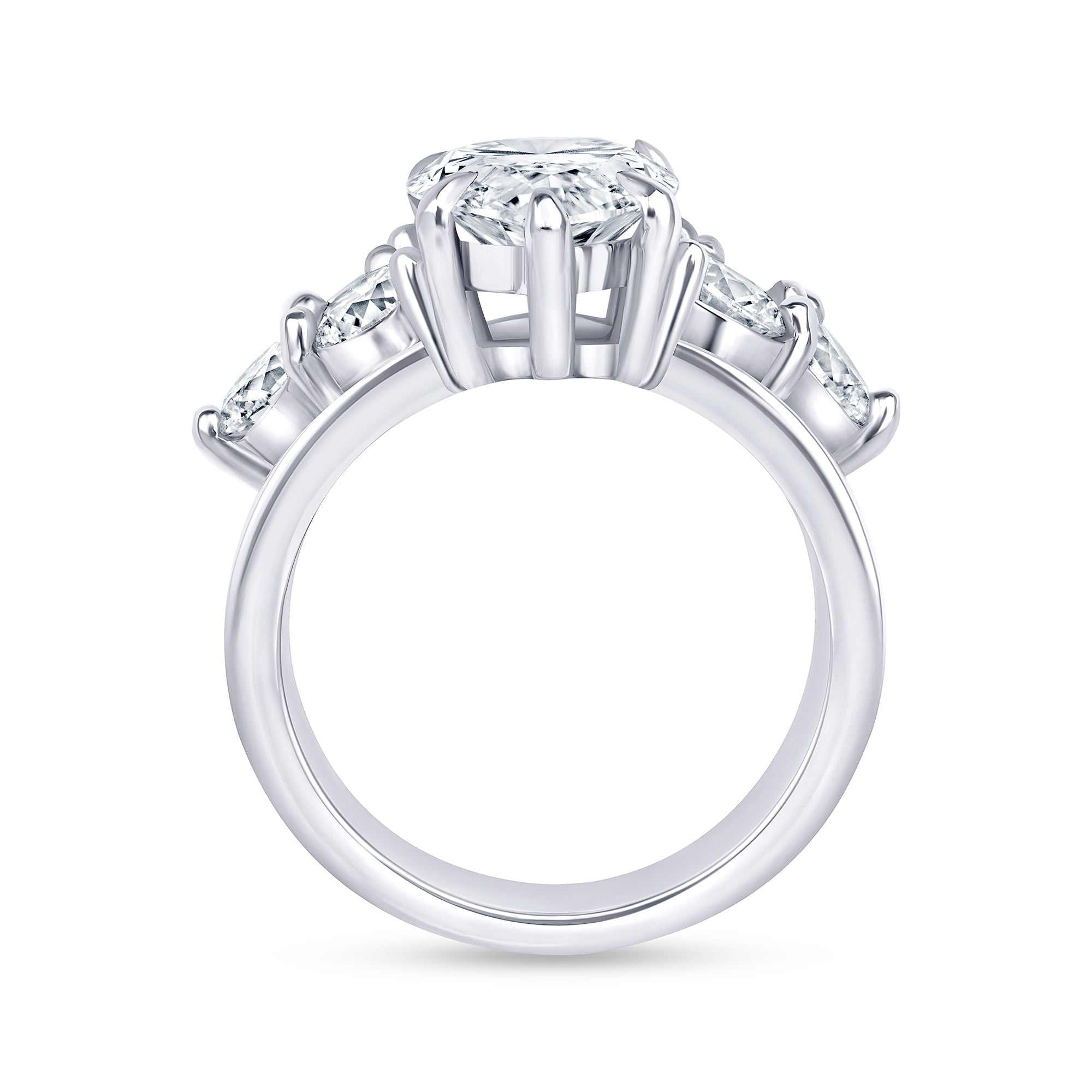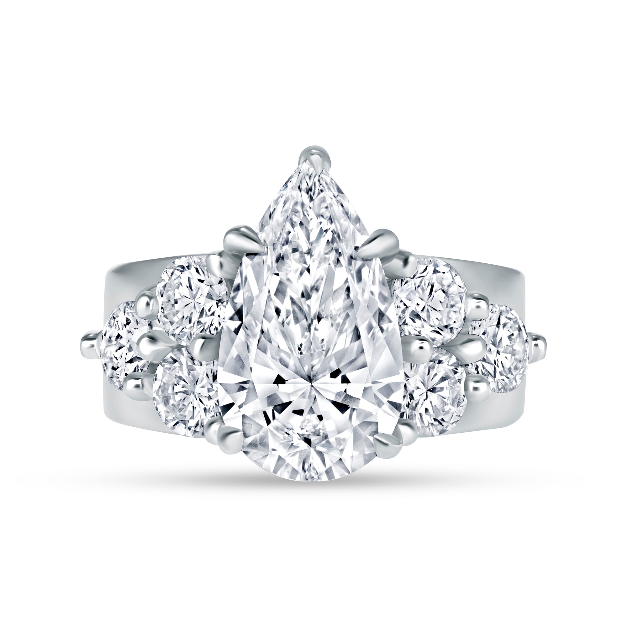 A contemporary twist on the classic pear-shaped diamond ring, this lab-grown engagement piece is beautifully accented with sparkling round-cut diamonds.